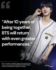On Friday night, Incheon’s Munhak Main Stadium was filled with purple lights and roaring cheers as BTS’ Jin wrapped up the encore leg of his RUNSEOKJIN_EP.TOUR. But amid the emotional performances and laughter, Jin gave ARMYs something even more electrifying — a heartfelt hint about BTS’ long-awaited comeback.