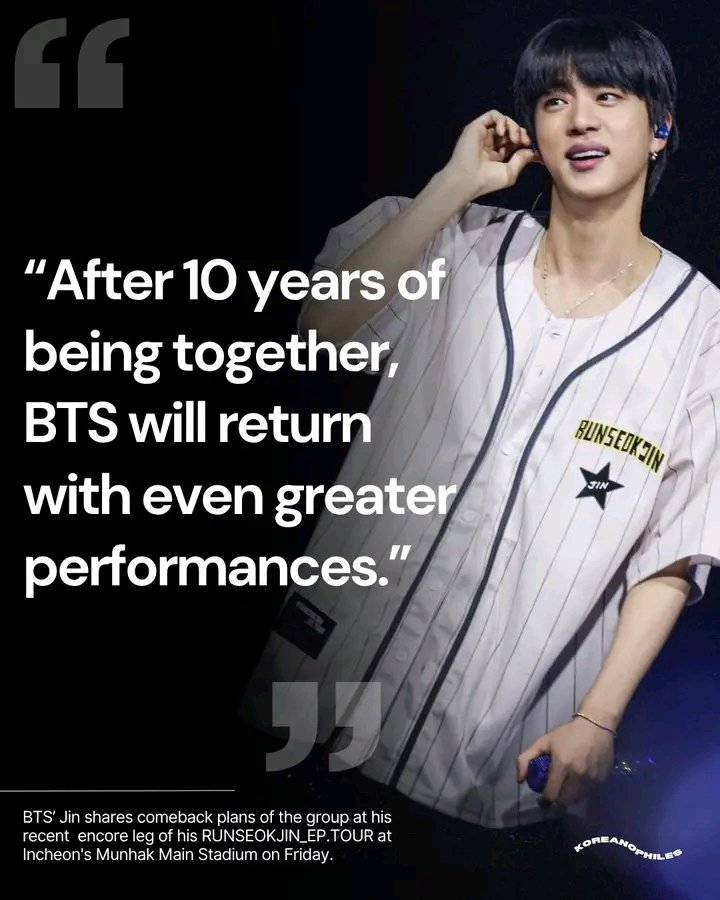 Home » BTS’ Jin Teases Long-Awaited Group Comeback: ‘10 Years After, 7 Forever’ — What He Revealed at RUNSEOKJIN_EP.TOUR in Incheon