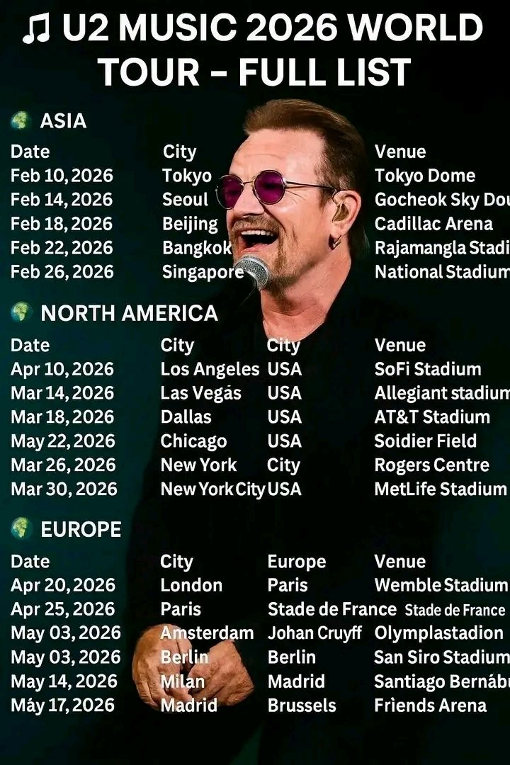 For many, this tour represents more than concerts—it’s a cultural moment. A chance to witness four artists who helped define modern stadium rock come together once again, stronger and more purposeful than ever. Whether you’ve followed U2 since the early days or discovered them through later eras, the 2026 world tour is shaping up to be a historic comeback you won’t want to miss.